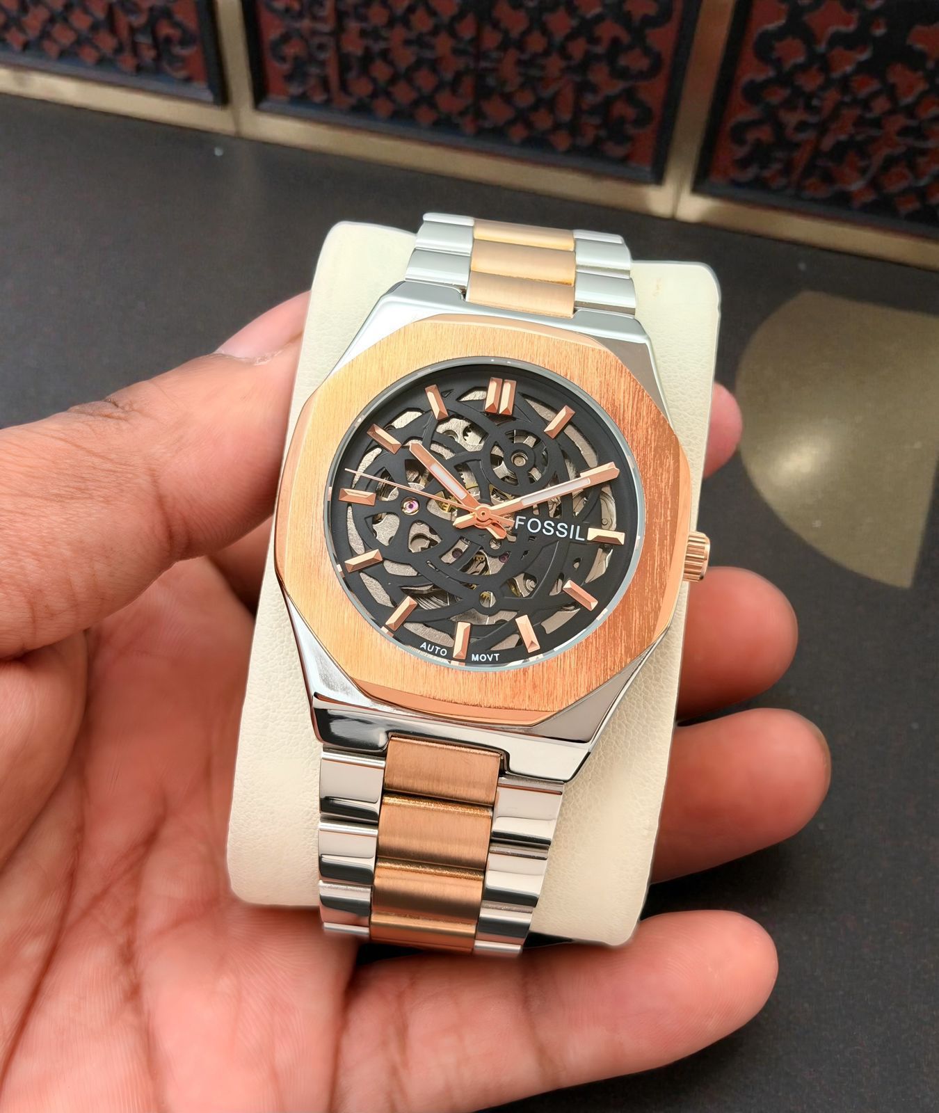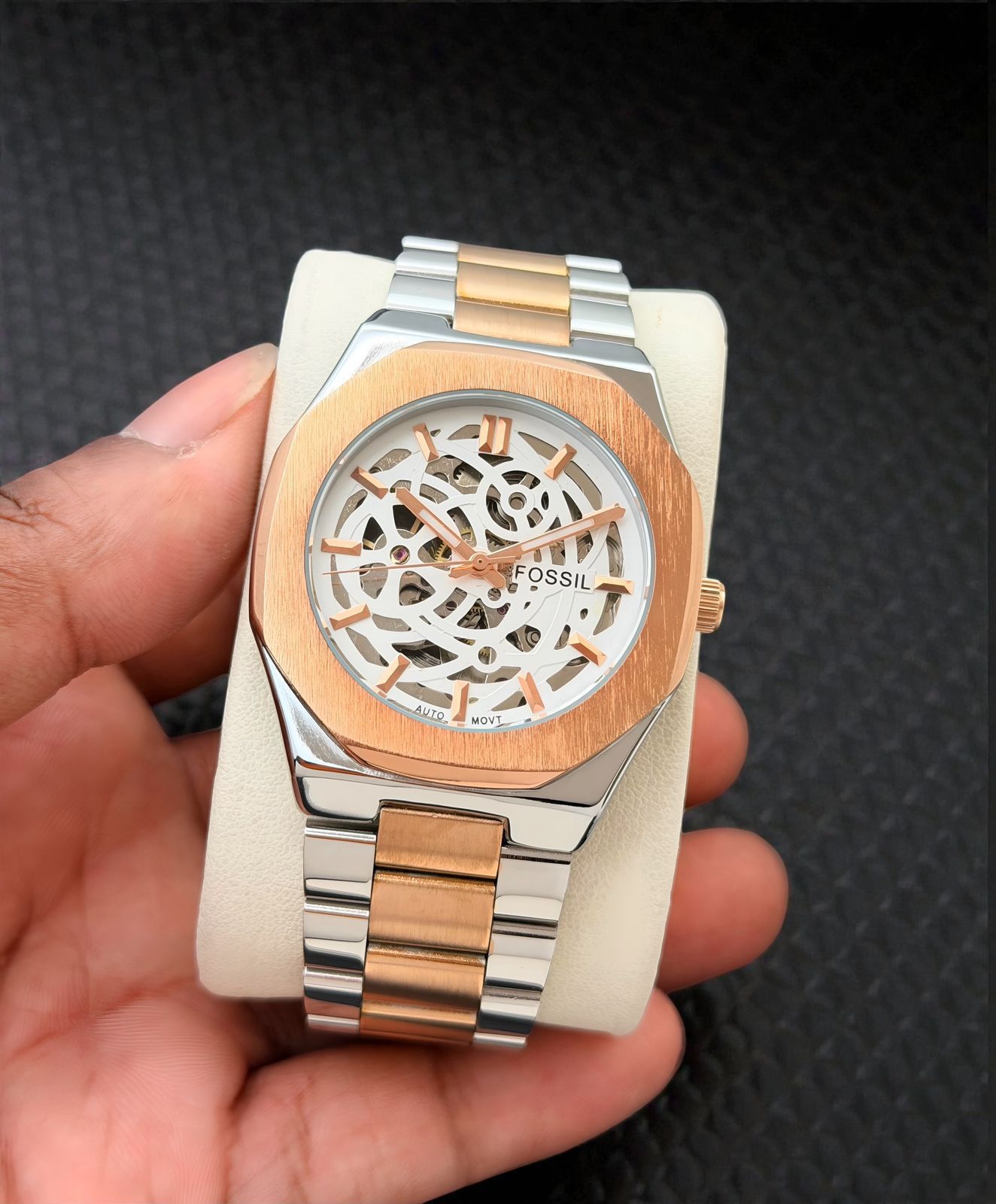 Stay ahead in style with this trending Fossil automatic watch, designed for men who appreciate classic craftsmanship with modern appeal. Built with a fully automatic movement, this timepiece runs smoothly without a battery — powered by the natural motion of your wrist.